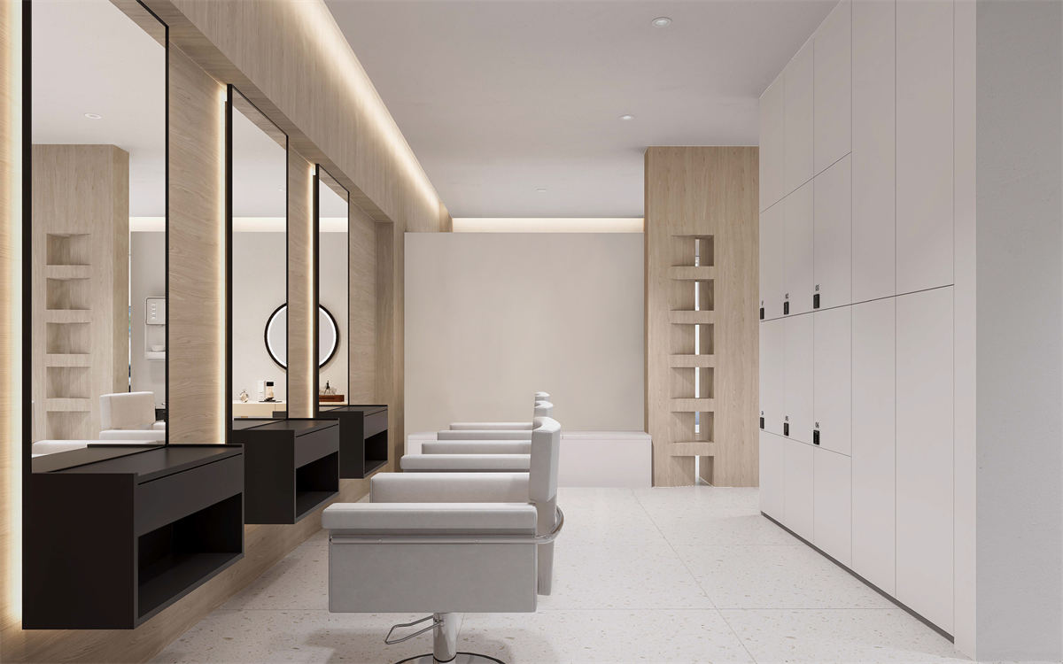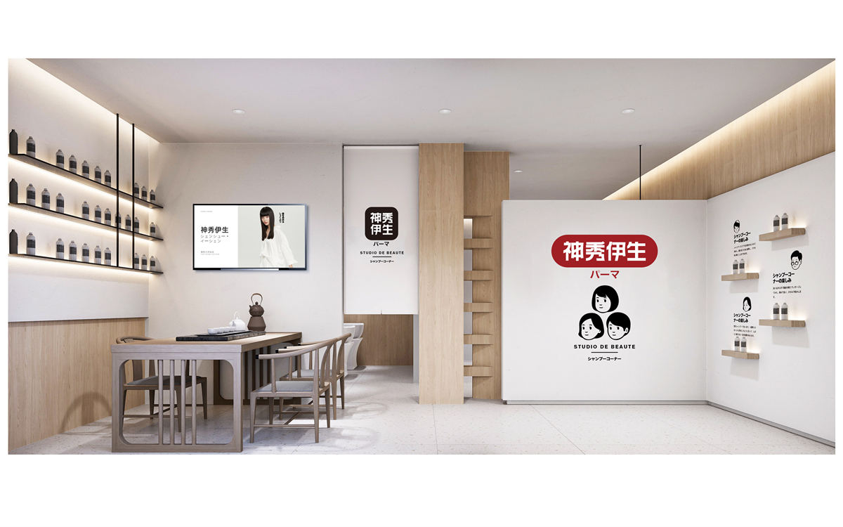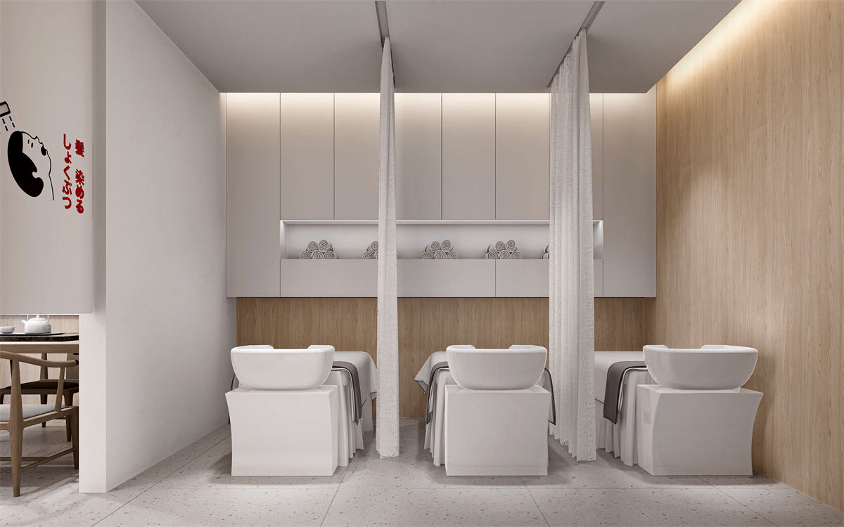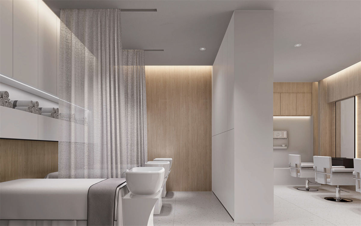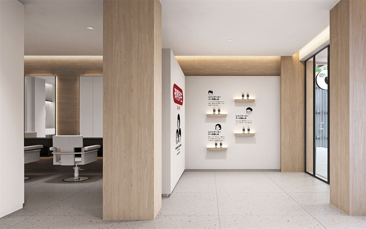 设计理念:本项目是一个专业的美容机构,设计风格采用典型的日式美学设计。房间内采用大量的原木色家具和装饰,如地板、桌子和架子等,这些都与白色的墙壁形成了鲜明的对比,使整个空间看起来更加温暖和自然。此外,一面墙专门用于展示各种产品,这不仅增加了空间的功能性,也突出了品牌形象。